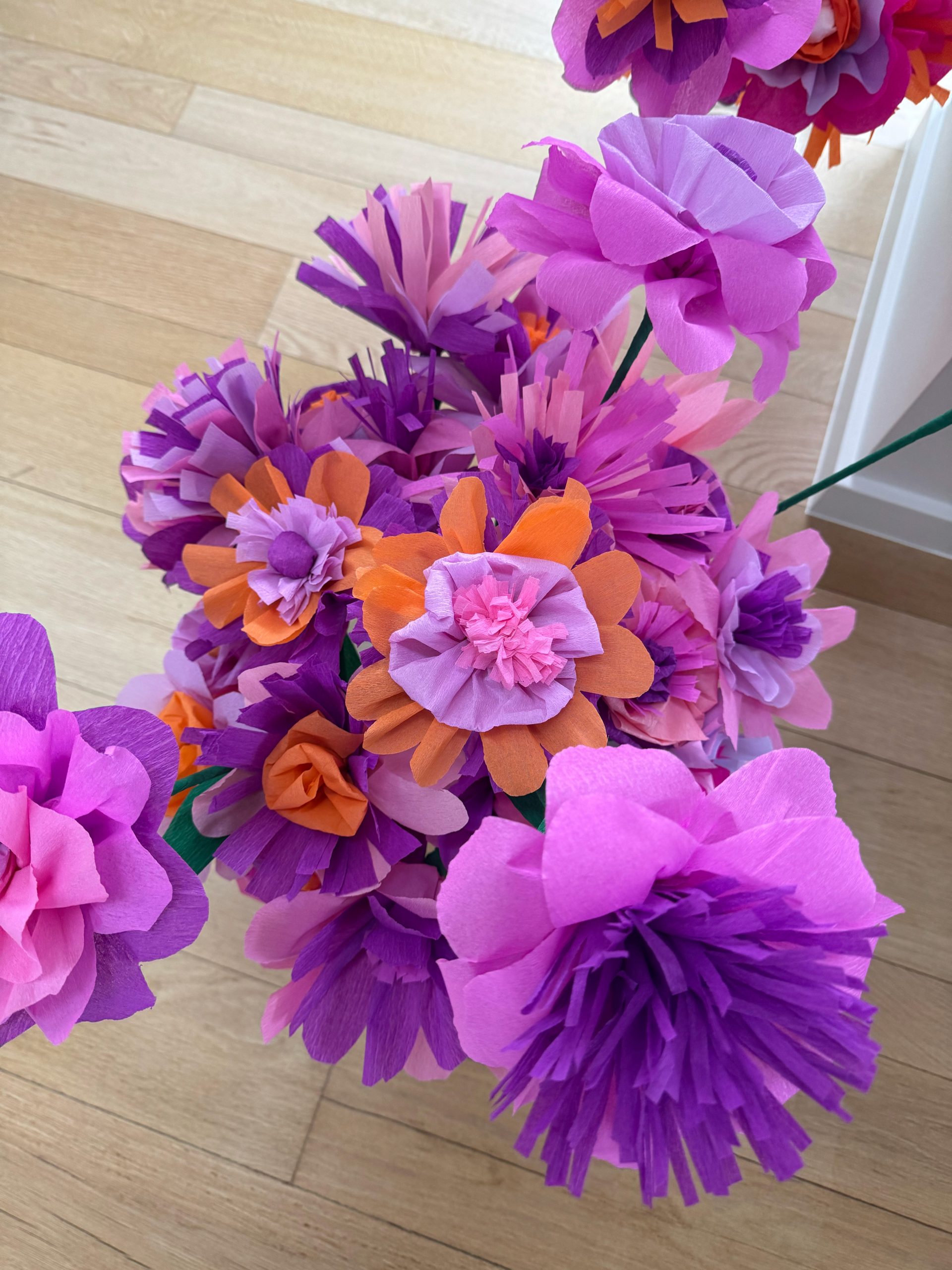 En zeg niet zomaar strandbloemen... Want achter elke bloem schuilt geduld* en inzicht van drie creatieve madammen. Dankjewel aan mama, Johanna en Christine om enthousiast mee te plooien, knippen, vouwen, lijmen,... Het was niet evident, maar we kregen het voor elkaar!